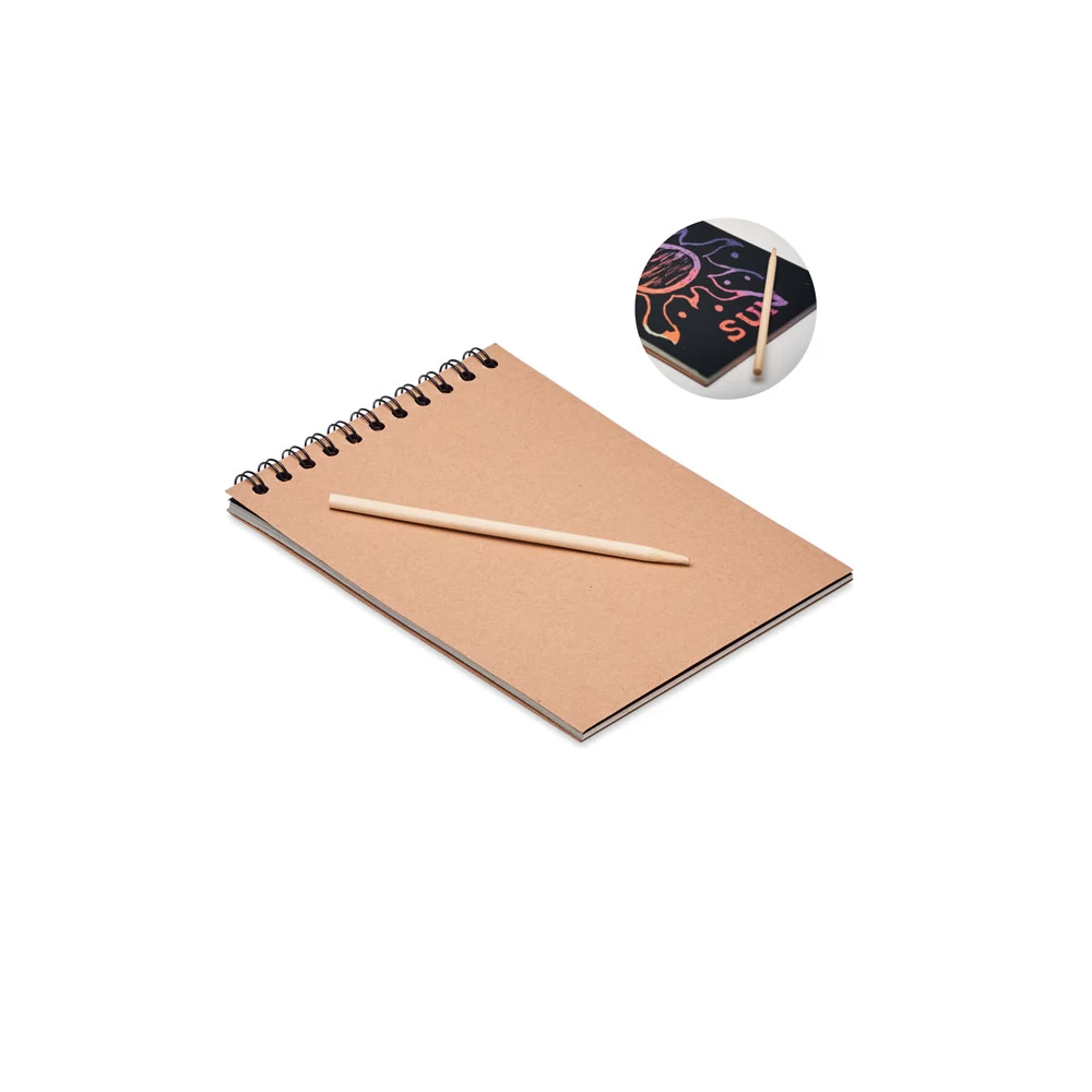 Gyűrűs kraft papír képkarcoló füzet, 10 fekete képkarcoló lapot és fatollat tartalmaz.
