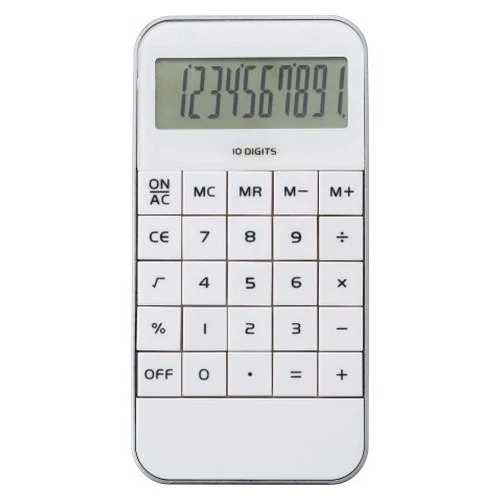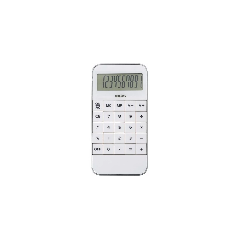 Mobiltelefon alakú 10 karakteres számológép ezüst szegéllyel. Memória, százalékszámítás és négyzetgyök számítás funkciókkal.